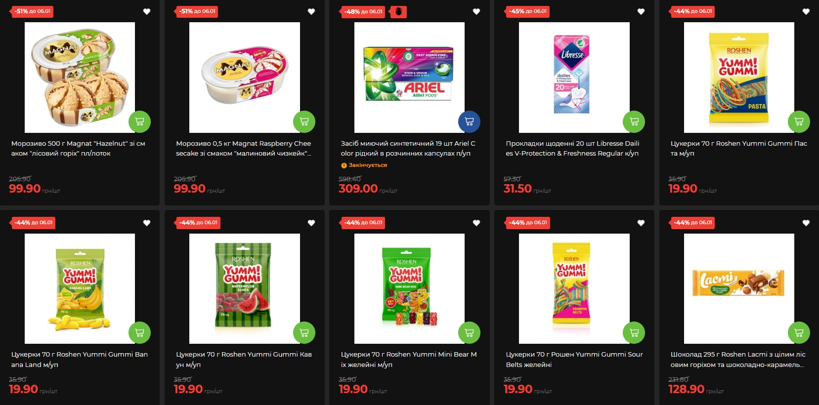 Шоколадні плитки Lacmi від Roshen вагою до 295 грамів продають зі знижкою 44%. Залежно від смаку ціна коливається від 109,90 до 128,90 гривень замість 196–231 гривні. Желейні цукерки Yummi Gummi теж потрапили в акцію з аналогічною знижкою — по 19,90 гривень за упаковку.