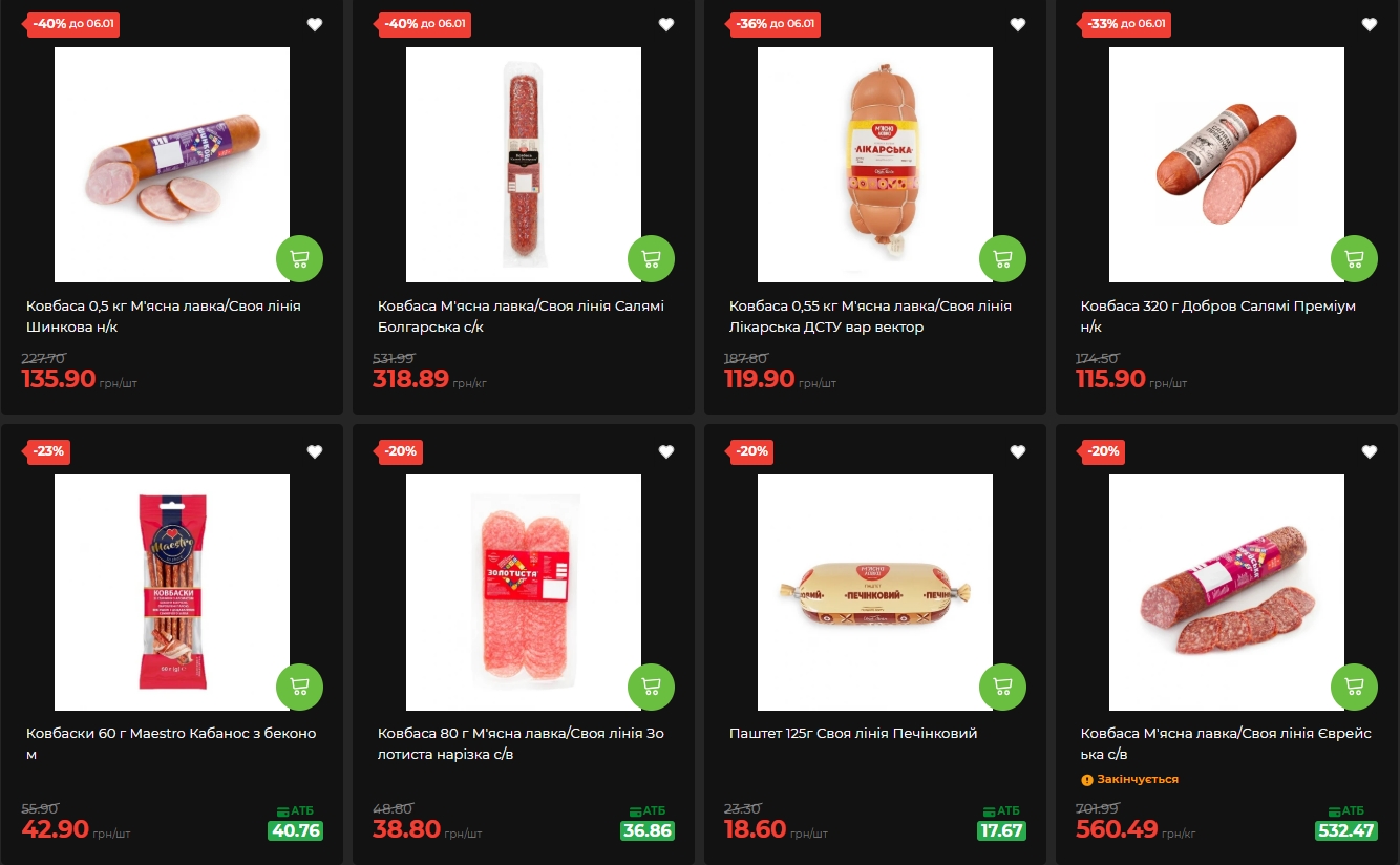 Ковбасна продукція представлена широким асортиментом зі знижками від 32% до 40%. Лікарська ковбаса за стандартом ДСТУ вагою 550 грамів коштує 119,90 гривень — економія 36%. Шинкова ковбаса напівкілограмовою упаковкою подешевшала до 135,90 гривень.