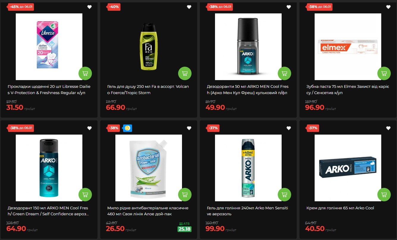 Чоловіча косметика ARKO MEN отримала одні з найбільших знижок — 38% на всю лінійку. Кульковий дезодорант коштує 49,90 гривень, аерозольний — 64,90 гривень. Зубна паста Elmex для захисту від карієсу продається за 96,90 гривень зі знижкою аналогічного розміру.