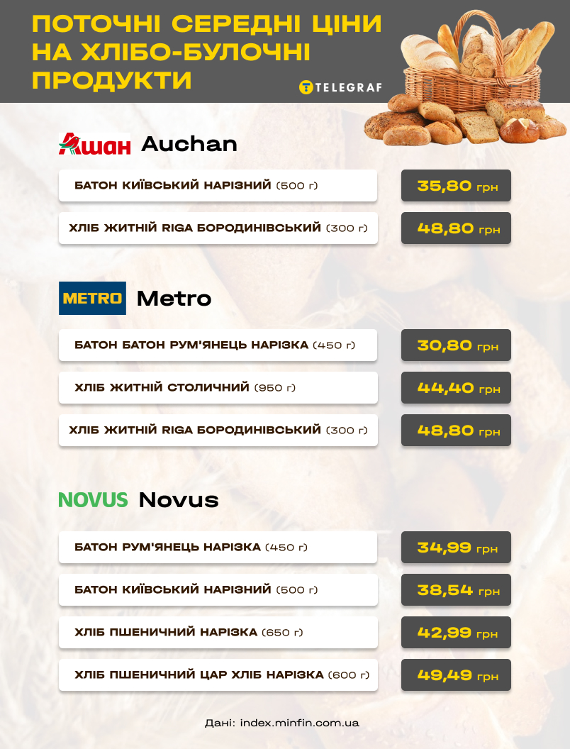 - батон коштуватиме 36-37 гривень за 500 грамів (зростання на 15-17%).
