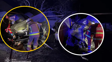 У Дніпрі надзвичайники деблокували водія з понівеченого внаслідок ДТП автомобіля. Він в'їхав у стовп, який упав на транспортний засіб й розчавив його вщент.