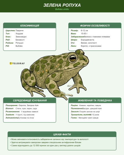Зелена ропуха (Bufotes viridis) — це отруйна амфібія, яка має зелене забарвлення з темними плямами, отруйні залози на шкірі, здатність виділяти токсини при загрозі, розмір до 10-12 см.