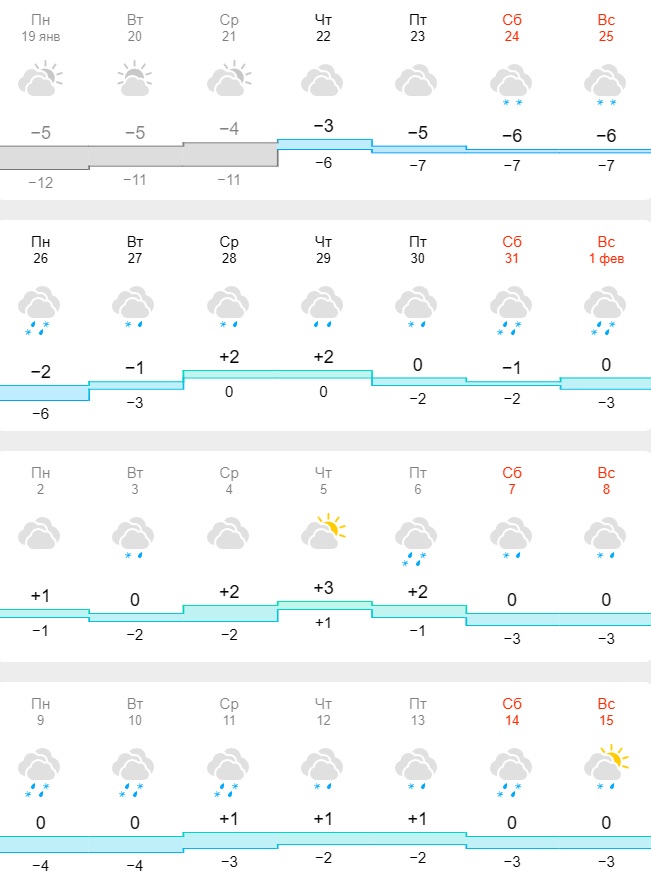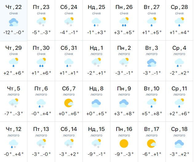 Так, за даними синоптиків сервісу meteofor, починаючи з 22 січня до лютого в обласному центрі спостерігатиметься суттєве потепління. Стовпчики термометрів різко піднімуться до -3-6 градусів, а під час найтепліших днів будуть в межах 0+2 градусів. Водночас на місто обрушаться затяжні опади. з 24 січня по 1 лютого сніжитиме, іноді до снігу може додаватися дощ.