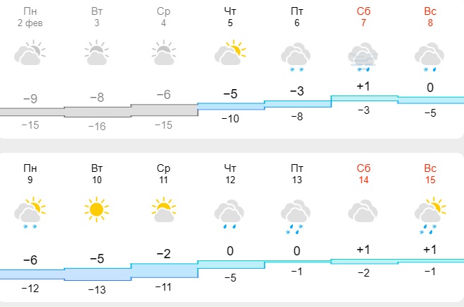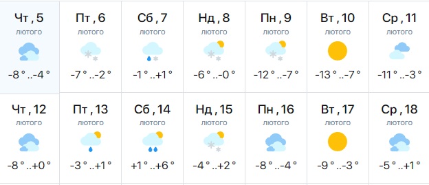 Про це повідомляється у прогнозах погоди. Так, за даними синоптиків сервісу Meteofor, з 9 по 11 лютого в обласному центрі похолодає до -6-13 градусів, хоча перед цим з 5 по 8 лютого очікується хвиля потепління — до +1 градуса. Також у цей період можливі опади у вигляді дощу та снігу.