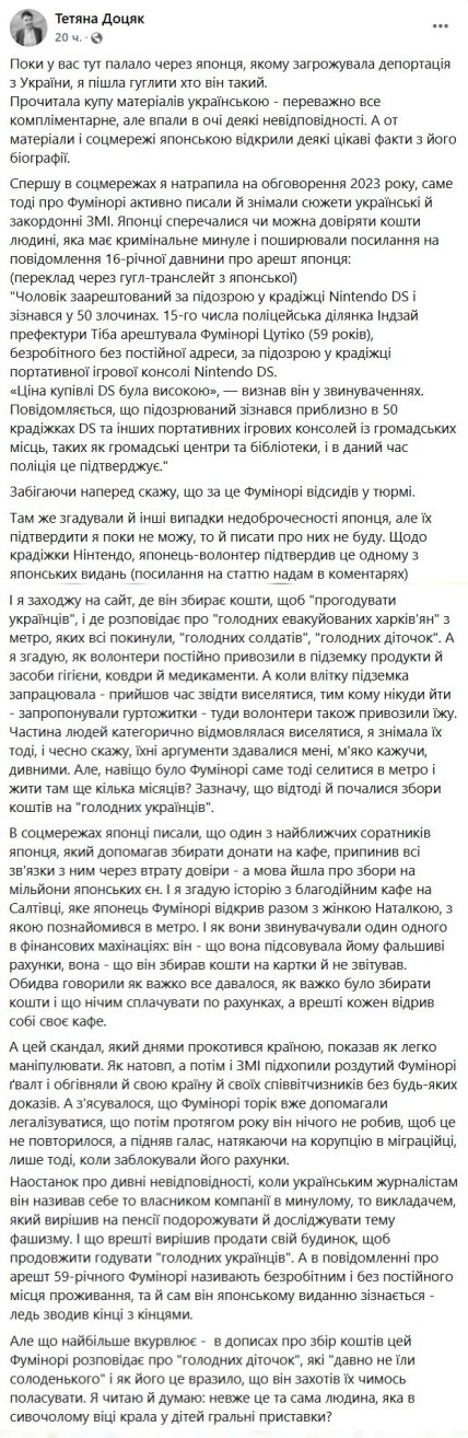 Журналістка додала, що натрапила на обговорення в соцмережах, де японці запитали, чи можна довіряти кошти людині з кримінальним минулим. Також вона каже, що бачила й інші повідомлення про недобросовісність Фумінорі Цучико, проте не має підтверджень.