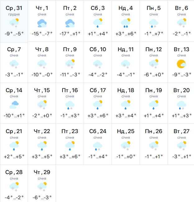Так, за даними синоптиків сервісу meteo.ua, у першій половині січня переважатиме холодна морозна погода. Однак, починаючи з 15 числа, погода розвернеться у бік потепління. Якщо на початку місяця морози можуть досягати -15 градусів, то з другої половини місяця переважатиме температура близько 0 і навіть плюси. Часом можливі опади у вигляді снігу, які разом із потеплінням перетворяться на дощ.