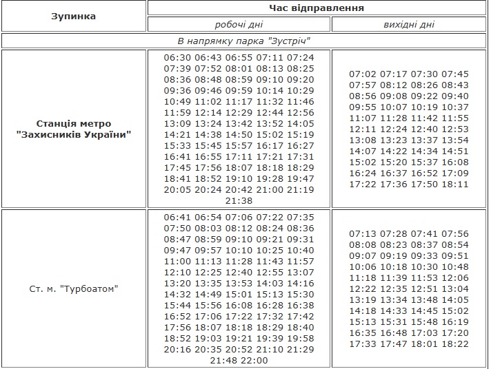 - станція метро "Захисників України" — у робочі дні — з 6:30 до 21:38. У вихідні — 07:02 до 18:11.