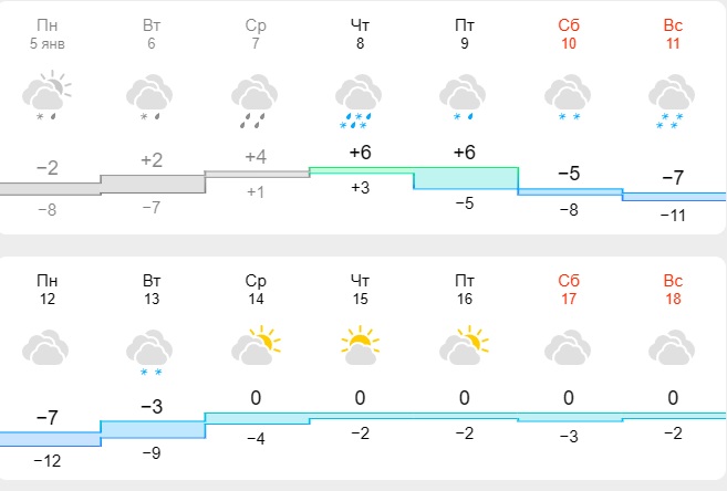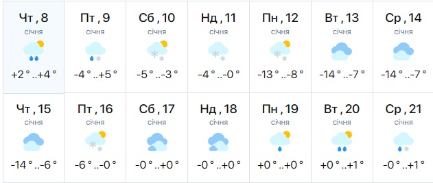Так, за даними спеціалістів сервісу meteo.ua, вже з 12 січня до обласного центру можуть прийти люті морози. Вони, ймовірно, продовжаться до 15 січня. У цей період температура повітря буде на рівні -6-14 градусів. У деякі дні можливі опади у вигляді снігу.