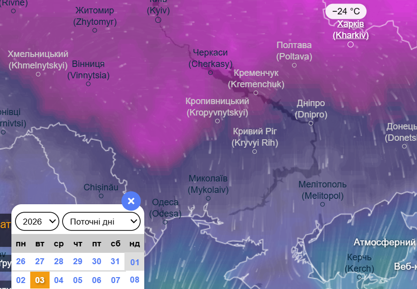 Крім того, за даними метеоплатформи Ventusky, температура повітря у Харкові 3 лютого може опуститися до -24 градусів у нічний час. Удень буде до -17 градусів, без опадів.