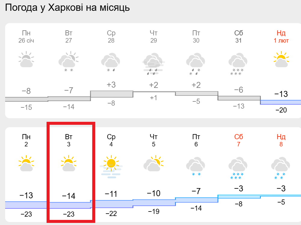 Такий прогноз було опубліковано на кількох українських погодних сайтах. Синоптики обіцяють, що найхолоднішим днем на місяць може стати 3 лютого.