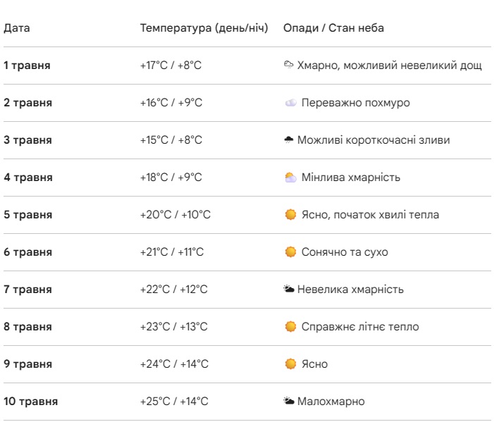 За даними ресурсу, перші дні місяця, ймовірно, будуть дощовими. Температура повітря 1 — 4 травня перебуватиме на рівні 17-18 градусів вдень та +8+9 вночі. Але вже до 10 травня стовпчики термометрів можуть піднятися майже до літніх 25 градусів.