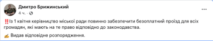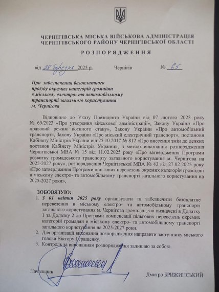 З 1 квітня 2025 року перевізники міського громадського транспорту зобов’язані забезпечити безкоштовний проїзд пільгових категорій пасажирів. Відповідне розпорядження 28 березня підписав начальник Чернігівської міської військової адміністрації Дмитро Брижинський.
