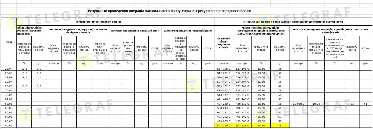 Вкладення в нацбанківські сертифікати масові, що також можна простежити за звітами. Приміром, 9 травня 2025 року 58 банків вклали в них одразу 507,3 млрд грн. Тобто вільні гроші (вільна ліквідність) становили пів трильйона, і їх вигідно вклали під 15,5% річних, щоб не пропадали дарма.