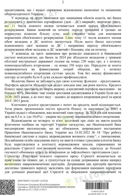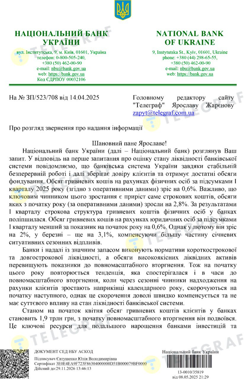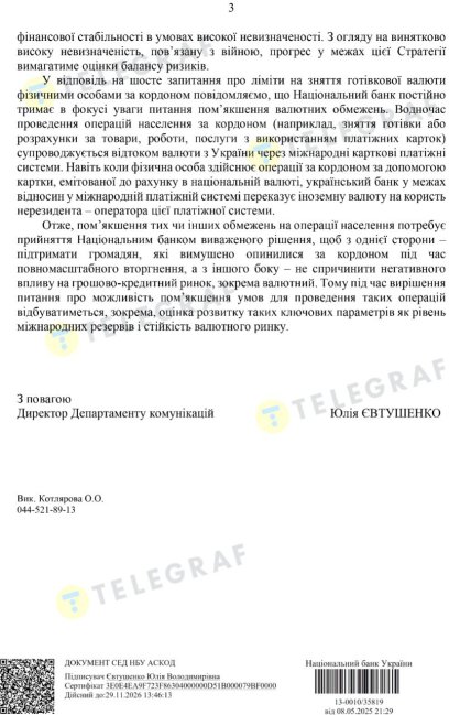 Такий висновок можна зробити з офіційної відповіді Національного банку на запит "Телеграфу", яку підписала директор департаменту комунікацій НБУ Юлія Євтушенко.