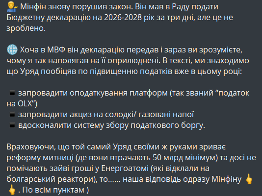 Народний депутат Ярослав Железняк заявив, що Міністерство фінансів не подало до Верховної Ради бюджетну декларацію на 2026-2028 роки у встановлений законом термін, але передало її Міжнародному валютному фонду. В оприлюдненому документі Мінфін зобов’язався підвищити податки вже у 2025 році.