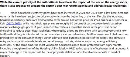 У новому меморандумі МВФ наголошується: попри зростання цін у 2023-2024 роках, тарифи на електроенергію для населення покривають близько 50% вартості, за якою її купує малий бізнес у Києві. Ціна на газ для домогосподарств також становить лише половину від ринкового рівня. Тим часом тарифи на тепло та воду залишаються замороженими від початку повномасштабного вторгнення.