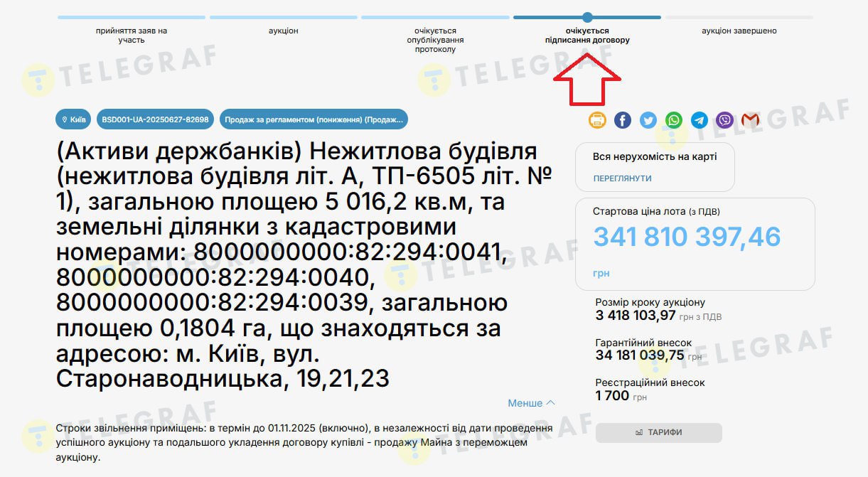 Все відбулось швидко, менше ніж за місяць. Аукціон з продажу приміщень по вул. Старонаводницька, 19, 21, 23 був запущений "Укргазбанком" на ProZorro 27 червня 2025 року та завершився 14 липня. Початкова ціна — 341,8 млн грн, а підсумкова в угоді — 317,9 млн грн.