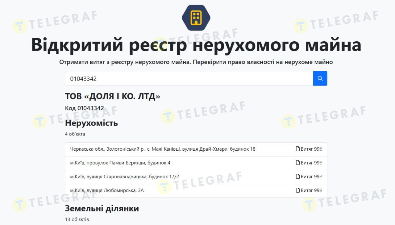 Загалом на поточний момент у реєстрі нерухомого майна на компанію зареєстровано чотири будинки за такими адресами: