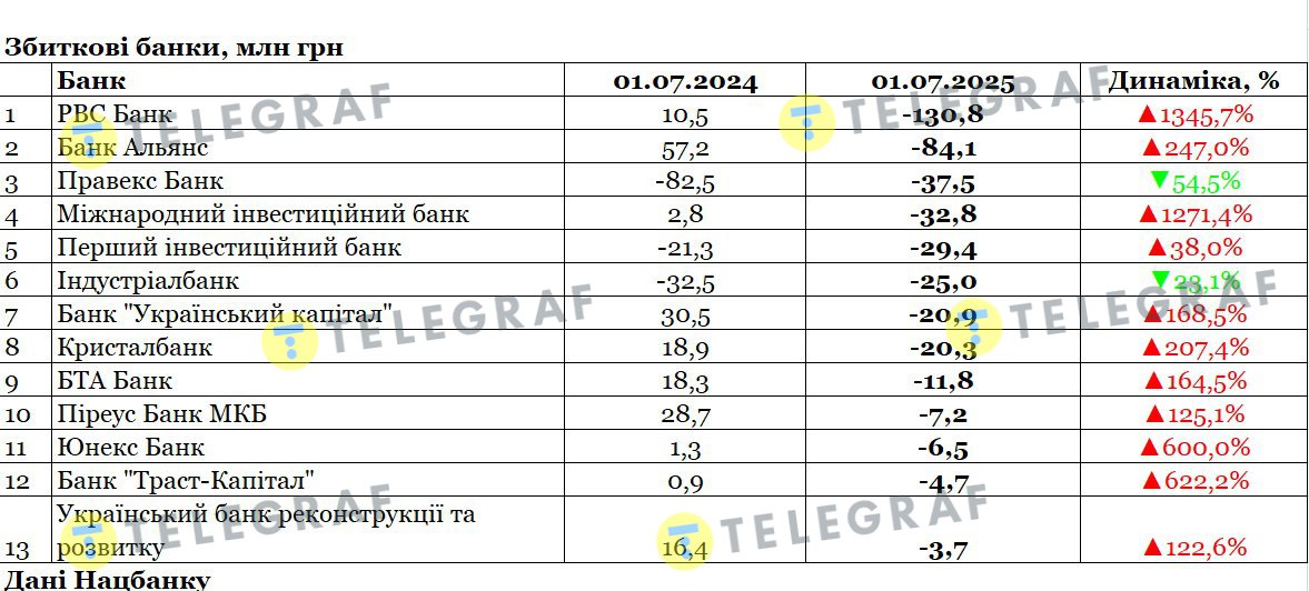 У число 13 збиткових банків на 1 липня 2025 року увійшли Міжнародний банк інвестиційний банк, де найбільшим акціонером лишається експрезидент Петро Порошенко, який цьогоріч потрапив під санкції. А також націоналізований Перший інвестиційний банк (-29,4 млн грн) та Піреус Банк МКБ (7,2 млн грн), де найбільший акціонер грецький Piraeus Financial Holdings S.A.