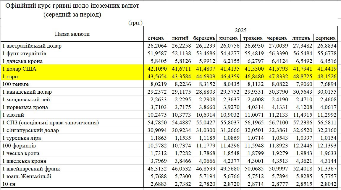 Такі самі відмінності можна побачити, і коли подивитися на середній курс гривні до інвалют, який Нацбанк обчислює щомісяця. Для серпня 2025 року по долару це було 41,44 грн/$, по євро — 48,15 грн/€.