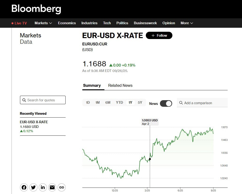 А більшість фінансистів відверто каже, що відкат світового курсу євро/долар до 1,08 зовсім нереальний. Останнього разу ринок бачив такі значення на торгах аж на початку квітня 2025 року, що видно по ретроспективних значеннях Bloomberg. Після чого вартість євровалюти сягала 1,1867 та згодом фіксувалась на геть інших рівнях: у вересні трималась переважно близько позначки 1,17, а під кінець місяця відійшла до 1,1670—1,1680.