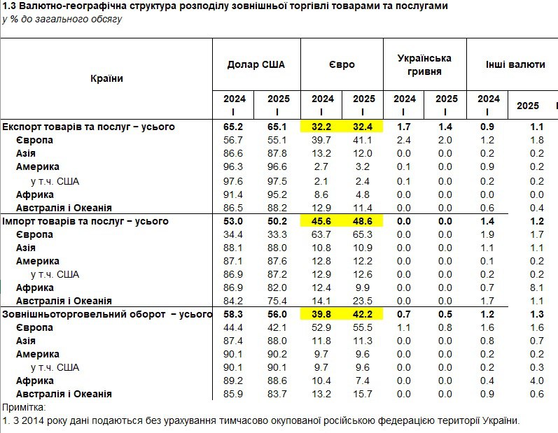 Якщо дивитися на валютну структуру торгівлі, то там частка євро найбільше зросла в імпорті — з 45,6% до 48,6% й менше в експорті — з 32,2% до 32,4%. А в загальноторгівельному обігу євроскладова збільшилась з 39,8% до 42,2%, відповідно поступово зменшувався вплив долара.