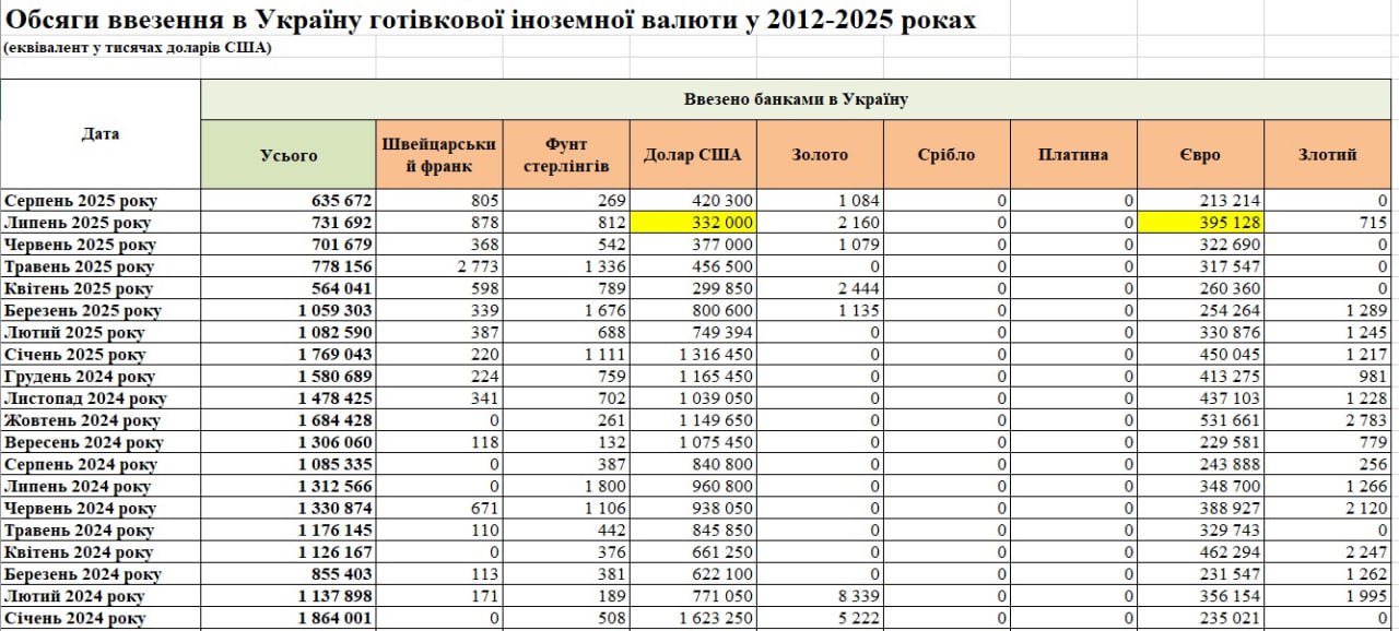Якщо за підсумком 2021 року на євро припадало лише 2,3% всіх завезених іноземних банкнот, а на долар — одразу 94,7% (3% — інші валюти), то цьогоріч вже 34,7% із привезеного банками було євровалютою, і тільки 64% — американською грошовою одиницею. А одного місяця у 2025-му (у липні) євро було імпортовано навіть трохи більше, аніж долара: на $395,1 млн проти $332 млн.