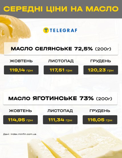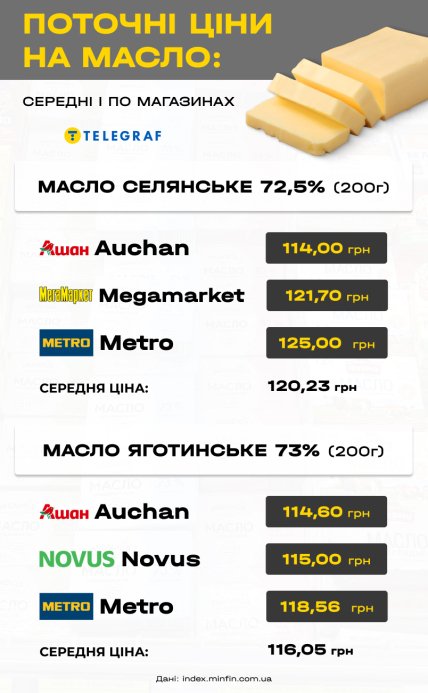 "Ціна масла, якщо 82-відсоткове було в районі 350-400 гривень за кілограм, зараз вже нижче 300. Відпускні ціни на заводах на фасовану пачку вже в районі 70-80 гривень. Чому така ціна зберігається на полиці — це більше питання до ритейлу", — зазначив виконавчий директор Спілки молочних підприємств.