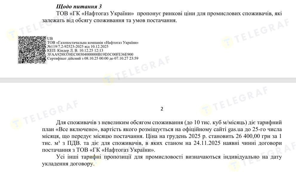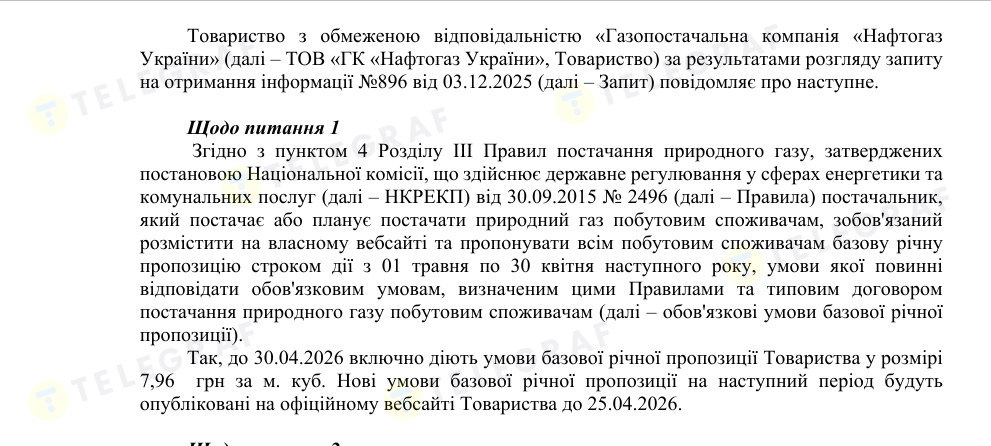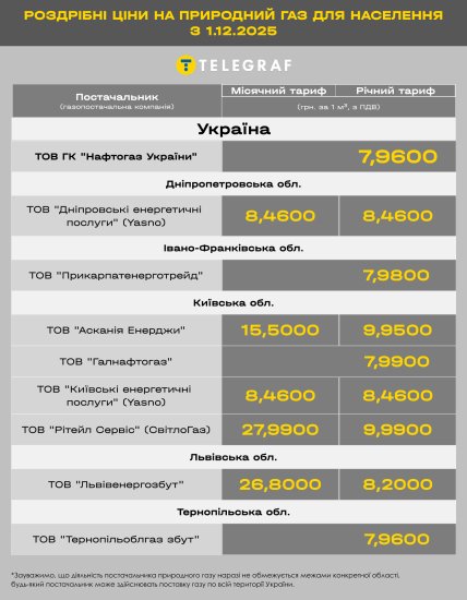 Це у 3,3 раза більше, ніж платять звичайні українці. Тариф застосовується до клієнтів, які станом на 24 листопада 2025 року мали чинні договори постачання з "Нафтогазом".