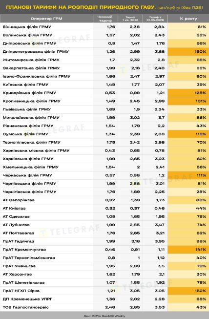 Найбільше подорожчання очікується у Дніпропетровській філії газорозподільної мережі — тариф може зрости до 3,66 грн за кубометр (без ПДВ) з 1 квітня 2026 року. Це майже втричі більше, ніж зараз.