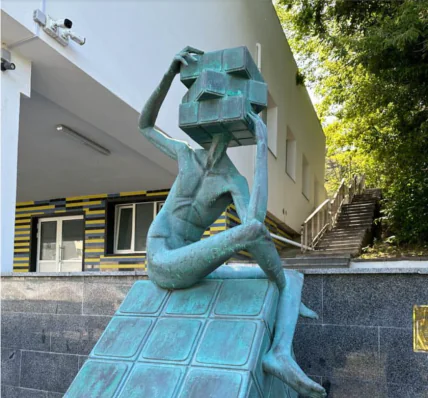 На території київської міської психіатричної лікарні №1 імені Павлова встановлено незвичайну скульптуру, яка має глибинний філософський підтекст. Арт-об’єкт з’явився тут у 2022 році та його автором став відомий столичний скульптор Богдан Казаченко.