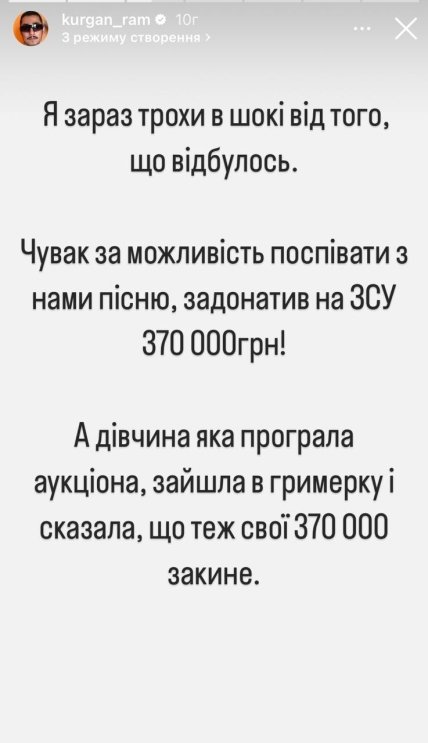 Також Курган на своїй сторінці в Instagram поділився, що дівчина, що програла в аукціоні, також задонатить 370 тис. гривень. Співак розповів, що фанатка зайшла після концерту до них у гримерку і повідомила про це.