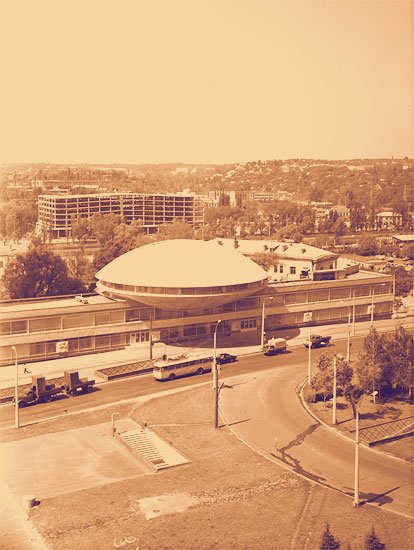 Будівля у формі тарілки — це класичний радянський модернізм, представлений космічним футуризмом. У приміщенні за радянських часів знаходився кінозал із фресками.