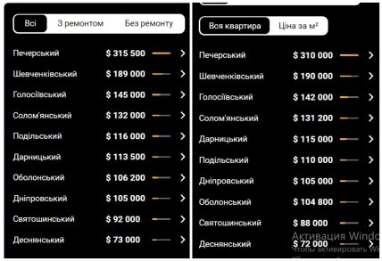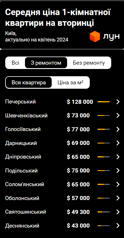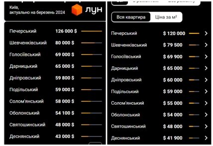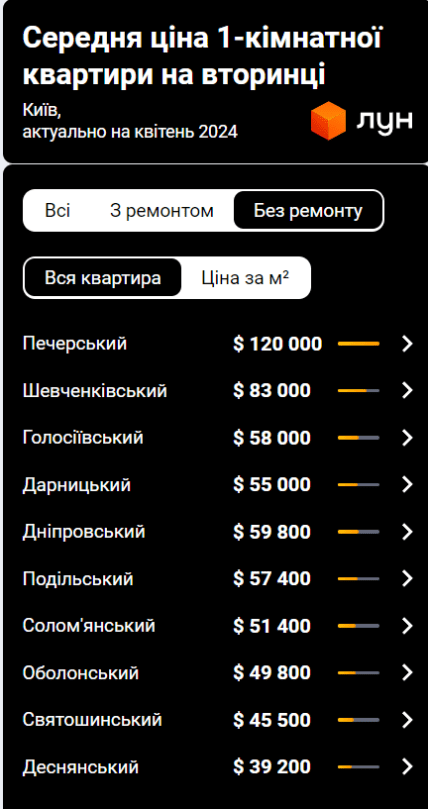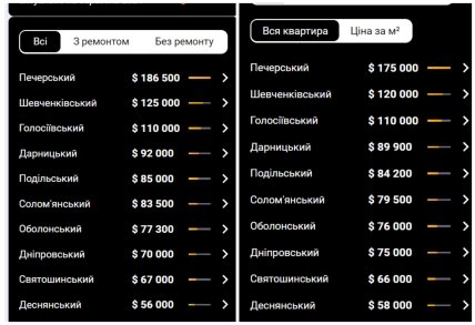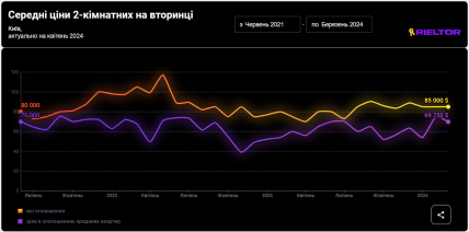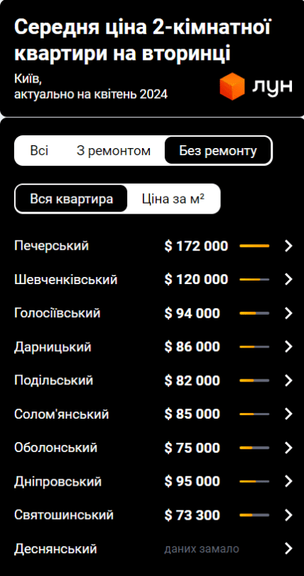 Наприклад, 2-кімнатна квартира на Печерську коштуватиме покупцям 175 000 $, хоча в березні 2024 за неї просили 186 500 $. У Шевченківському ж районі Києва двушка на "вторинці" у квітні 2024 року коштує — 120 тисяч доларів, а в Голосіївському — 110 тисяч доларів.