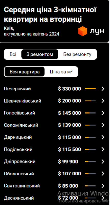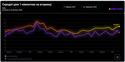 Наприклад, 3-кімнатна квартира на Печерську обійдеться покупцям у квітні 2024 року в 310 000 $, замість 315 500 $, які просили за аналогічну житлову площу в березні 2024 року.