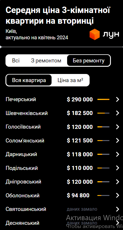 У Шевченківському районі трикімнатна квартира коштує — 190 тисяч доларів, а в Голосіївському — 142 тисячі доларів.