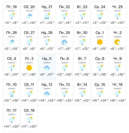 На Великдень, 5 травня, синоптики прогнозують хмарну погоду, проте без опадів. Температура повітря зранку буде +11°, вдень +17°. Вночі буде тепліше, ніж уранці, очікується +13°.