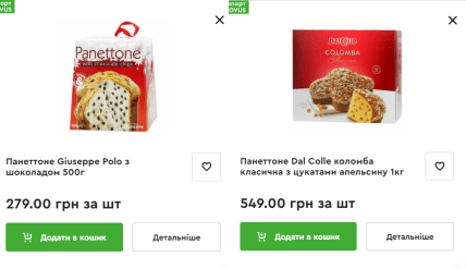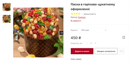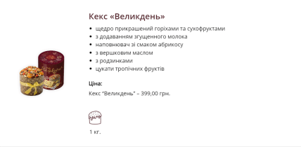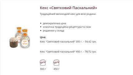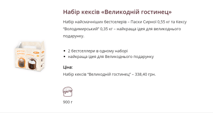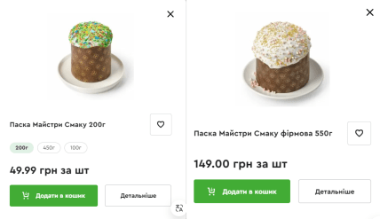 Кекс преміум якості коштують від 119 грн за 245 грамів. Трішки більший — 345 грамів коштує 149 грн. Є паски й по 474 грн.