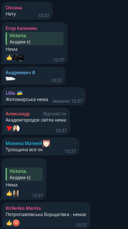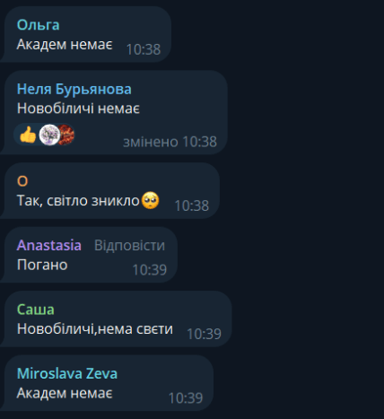 У телеграмі мешканці столиці пишуть, що електроенергії нема на Академмістечку і в Новобіличах.