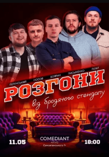 Розгони — імпровізаційний формат де коміки розповідають історії та ідеї для жартів і разом доводять їх до готових комедійних монологів.