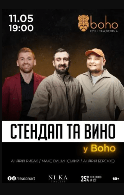 "Стендап та вино у Boho" – це чудова можливість провести незабутній вечір з коханою людиною або в компанії друзів, насолодитись келихом вина або коктейлем та від душі посміятись.