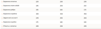 Задня нога на кості — 250 грн/кг. Баранина корейка в середньому коштує 400 грн/кг. Баранина ребро пропонують по 160 грн/кг.