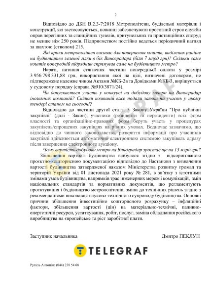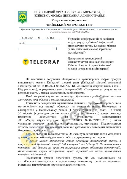 — Тривалість завершення будівництва дільниці Сирецько-Печерської лінії метрополітену від станції "Сирець" на житловий масив Виноградар з електродепо у Подільському районі (1 черга будівництва) — 30 місяців (відповідно до експертного звіту (позитивного) щодо розгляду проєктної документації на будівництво, затвердженого ДП "Укрдержбудекспертиза" від 20.12.2023 №00-0279/01-23/ПБ) після укладання договору з підрядною організацією, отримання підприємством дозволу на виконання будівельних робіт та з урахуванням доведення відповідних бюджетних асигнувань. Термін введення в експлуатацію об’єкта буде визначено після укладання договору на виконання будівельних робіт з підрядною організацією, — розказав топменеджер.