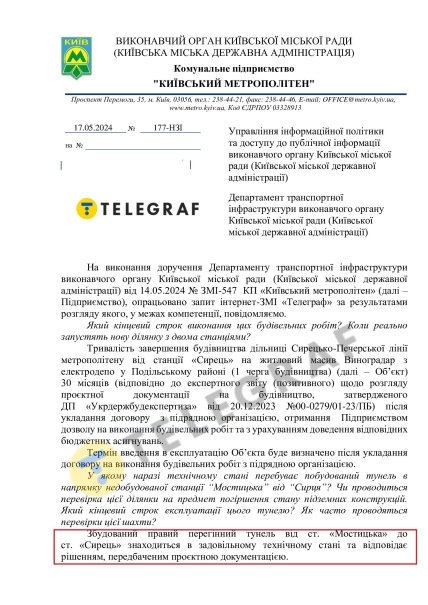 Разом з тим, як запевнили "Телеграф" у комунальному підприємстві "Київський метрополітен", збудований правий перегінний тунель від станції "Мостицька" до ст. "Сирець" станом на травень цього року знаходиться "у задовільному технічному стані та відповідає рішенням, передбаченим проєктною документацією". А метрополітенівці постійно ведуть періодичний нагляд за шахтою (стволом) № 215 під землею.