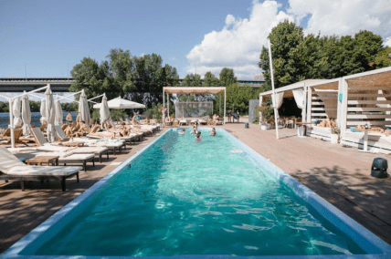 Місце відпочинку з басейнами біля Дніпра чудово вписалося у індустріальний міський краєвид. Тут є два басейни, тераса з видом на Дніпро та Loft-бар.