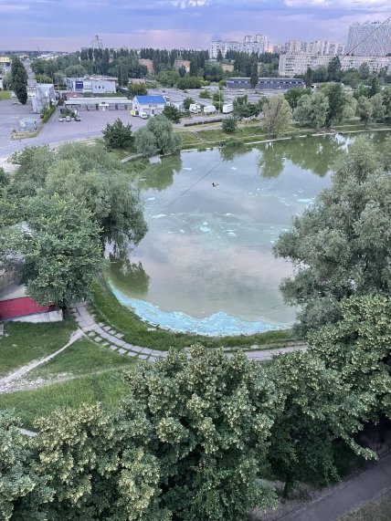 Поки рятують озеро Синє у Києві на Виноградарі, на озері Віра помітили плями яскравого блакитного кольору. Водойма знаходиться у Святошинському районі столиці.