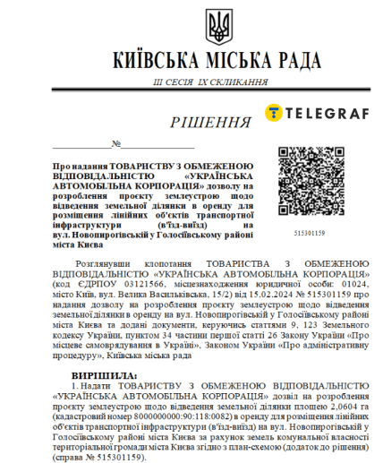 Компанії "Українська автомобільна корпорація" віддадуть земельну ділянку в оренду на вулиці Новопирогівській (Голосіївський район). Там планують "розмістити лінійні об’єкти транспортної інфраструктури (в’їзд-виїзд)", тобто автостоянку.