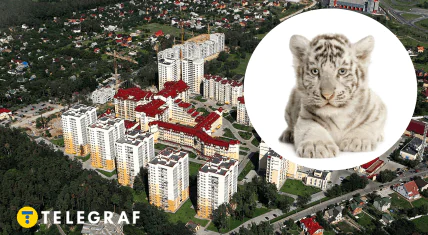 У селі Чайки дівчина з компанією вигулювала біле тигреня з блакитними очима. Хижак поводився досить спокійно і практично не реагував на звуки великого міста, але виглядав він все ж таки наляканим. На тварині був нашийник та повідець.