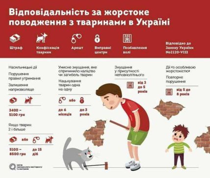 Також за жорстоке поводження з тваринами передбачено штраф у розмірі від 3400 до 8500 гривень, взяття під варту від 15 діб до півроку та виправні роботи.