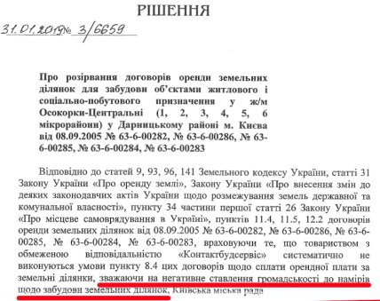 "Забудовник вирішив проігнорувати громаду. Тому тепер договір оренди розірвано остаточно! Це рішення – серйозний сигнал для інших забудовників, які нехтують інтересами міста, інтересами громади", — безапеляційно заявив Кличко після того, як у 2019 році Київрада розірвала договори з орендарем ділянок на Осокорках. І додав, що "проєкт забудови, отримав низку зауважень". Під рішенням про розірвання договорів, до речі, стоїть підпис міського голови.